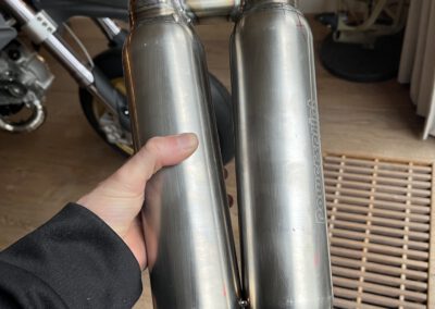 The double exhaust silencer set-up is also finished! Heat shielded to make sure the fairings will not meld off (other measures will also be taken). I used 2 short box Powersprint filters to fabricate this setup with balancing pipe just before entering the silencers.