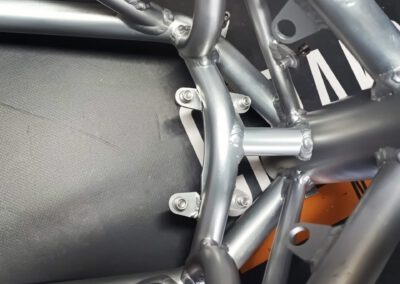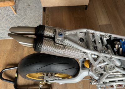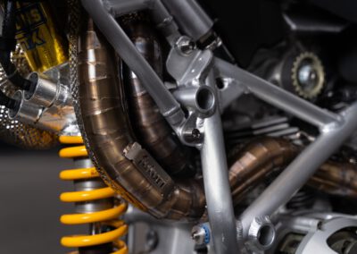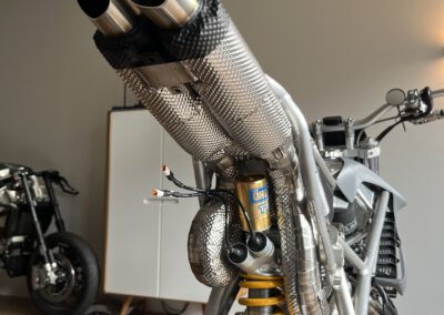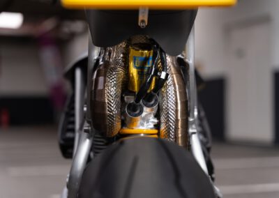 Without any problems!!! Allot of precautions had to be taken for the rear shock to not fail because of its proximity to the exhaust. A combination of ceramic wool (heat resistant up to 1000C) and 0.1mm stainless steel heat shielding covering this wool on the exhaust reduces radiation heat by 90% (also used in MotoGP)! Some parts of the exhaust have also been coated in Cerakote Piston coat to even further reduce radiation heat.
