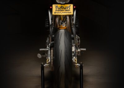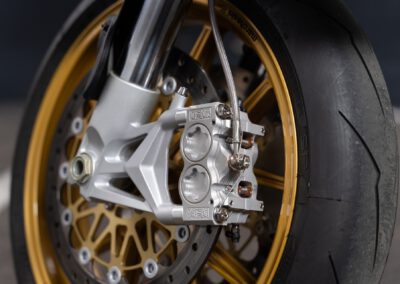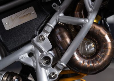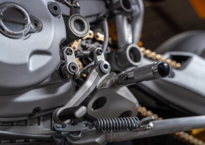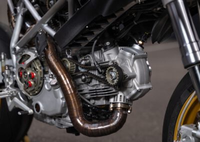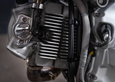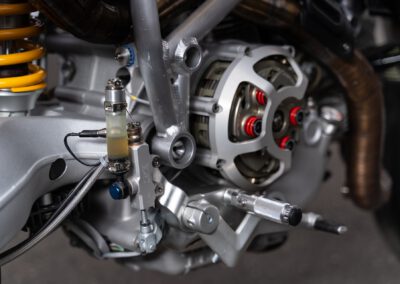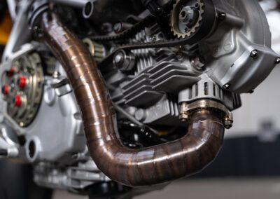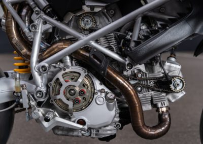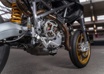 The engine originally is a Ducati 1100DS with a wet clutch from a Multistrada 1100. However in essence only the casting of the cases, cylinders and heads are original. All the rest has been modified.