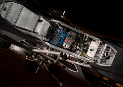 I have received so many comments from people that I would get heat issues with the shock and or exhaust. However that will not be the case since everything is now also heat shielded. The bottom of the seat, rear shock, battery box, side fairings, crankcase breather and exhaust fairing have all be lined with heat reflective fiberglass tape. The Öhlins TTX rear shock also received silicone/fiberglass cable sleeving to also protect the cables.